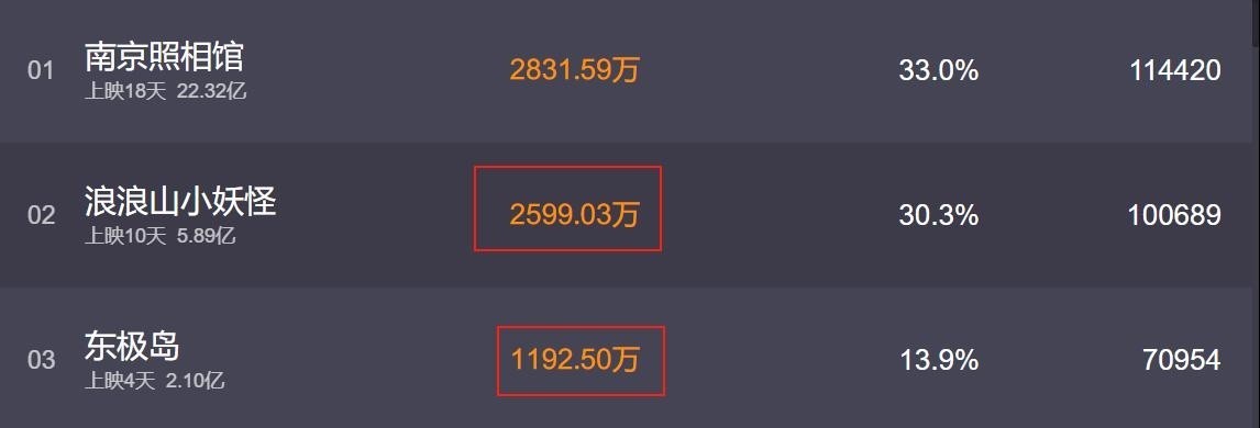 《浪浪山》票房逆势增长至六千一百六十二万元,《东极岛》却下滑至五千八百万元。