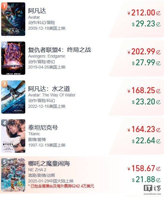 猖狂IT之家发稿,《哪吒之魔童闹海》环球累计票房达 158.67 亿元(包含港澳台及国外票房 6242.4 万好意思元),位居影史第五。