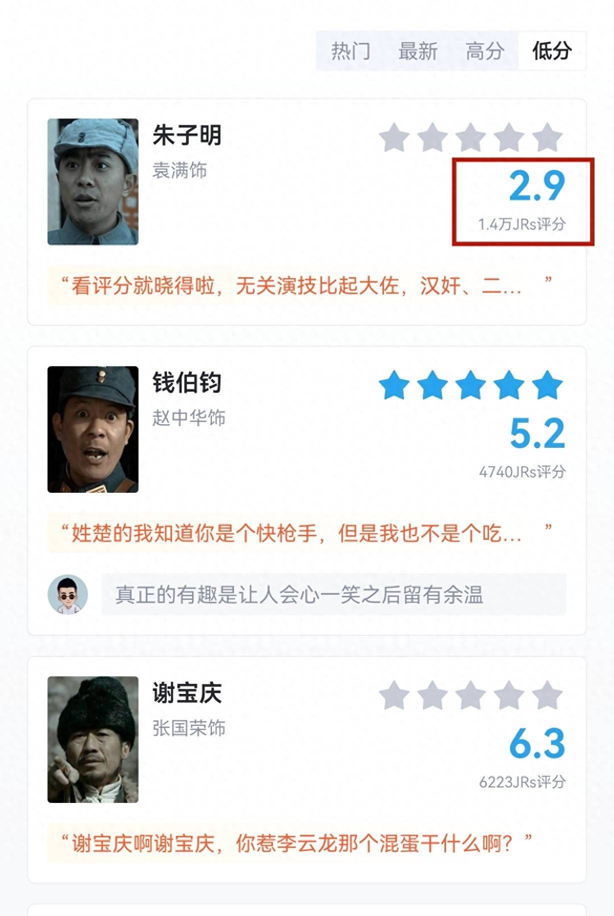 从虎扑评分就能看出来的,朱子明唯有2.9分,周边雷同是抵拒的钱伯钧,358团的一营长,东谈主家评分齐在5.2分,更别提被誉为滑冰小王子的谢宝庆,东谈主家也有6.3分,按理来说,这个扮装的塑造还算是很可以的,以致演员的演技也还算是可以的,岂论怎样看,齐不应该是口碑那么差的存在,那为啥会被不雅众嫌弃?