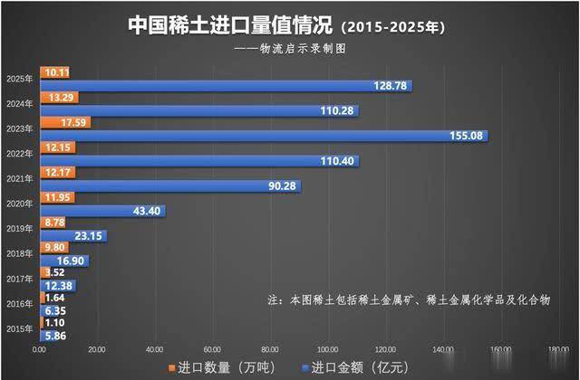以上稀土金属矿、稀土化学品/化合物两项预备,2025年我国对稀土总共入口数目10.11万吨,同比着落24.0%;入口金额129亿元,同比增长16.3%。