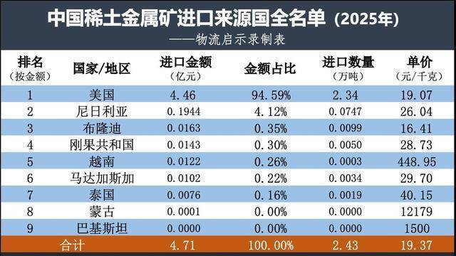2025年,我国共入口2.43万吨稀土金属矿(2024年为5.56万吨),入口金额4.71亿元(2024年为10.48亿元)。