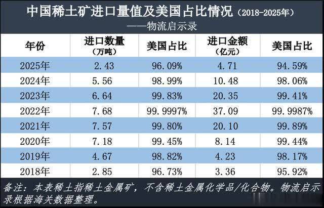我国稀土矿入口量值及好意思国占比情况(2018-2025年)