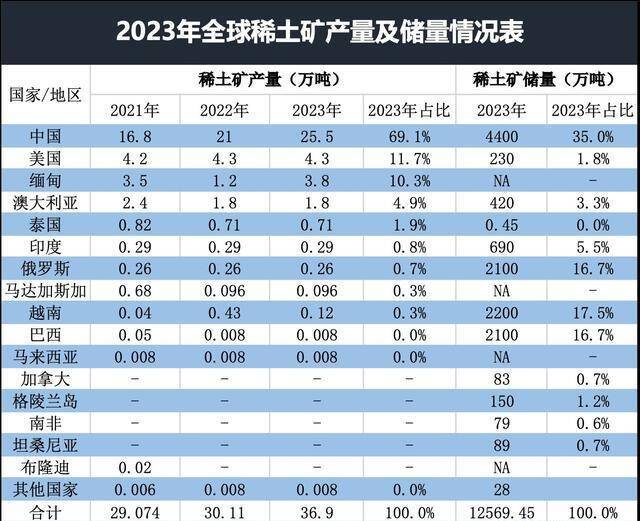 把柄好意思国USGS数据(2023年),巨匠稀土探明储量约1.26亿吨。其中,我国稀土储量4400万吨,占巨匠总储量的35.0%;稀土矿产量为25.5万吨,占巨匠稀土矿总产量的69.1%。