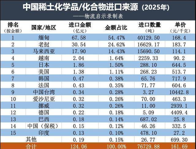 我国对稀土金属化学品/化合物的入口,主要来自缅甸、老挝、马来西亚,该三国预备金额占比93.5%,数目占比94.4%。