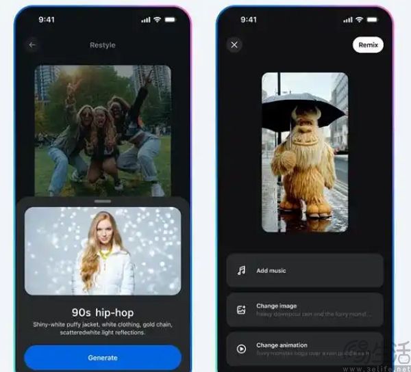 事实上,Vibes肖似于AI版块的抖音、快手,为用户提供了动画、殊效短片、捏造场景等AI生成的视频内容,而且还救助用户对Vibes信息流里刷到的视频进行 “再创作”(remix),然后再共享到Instagram、Facebook Stories。