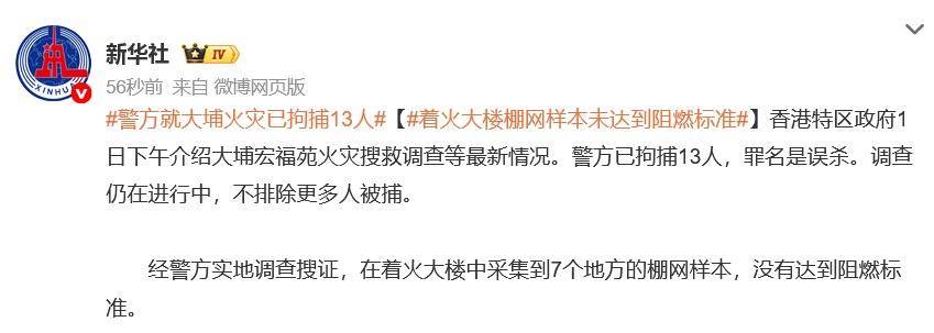 另据新华社音信,香港特区政府1日下昼先容大埔宏福苑失火搜救访问等最新情况。警方已拘捕13东谈主,罪名是误杀。访问仍在进行中,不排斥更多东谈主被捕。